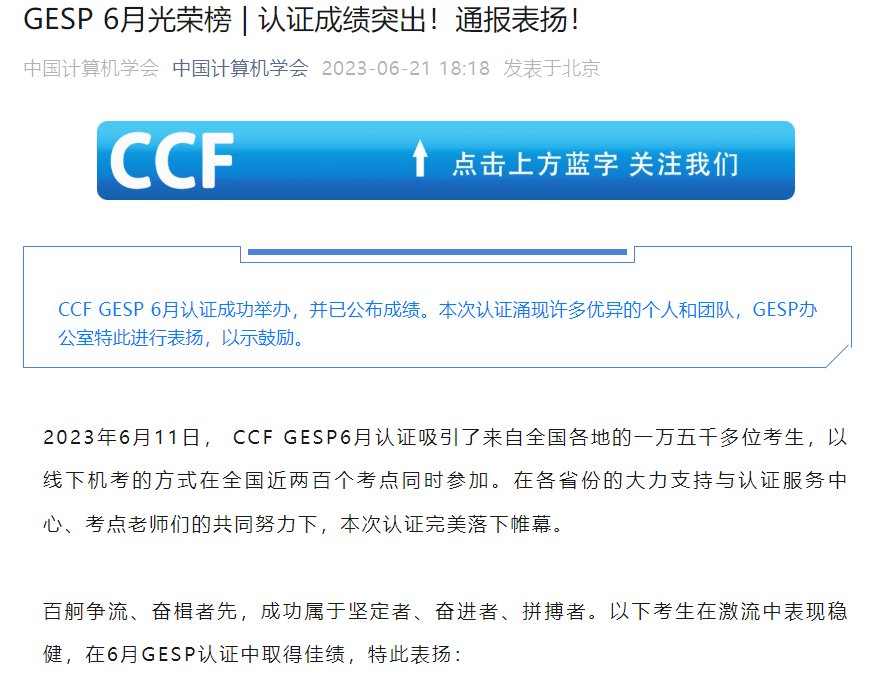 本网讯 近日,中国计算机学会官方公众号报道了GESP 6月认证情况,十大网投作为优秀考点之一上榜。本次认证考试于6月11日举行,来自全省各地的近500名中小学考生参加考试,澳门十大网投平台排行经过认真筹备、周密部署、规范考务,圆满完成了本次认证考试任务。