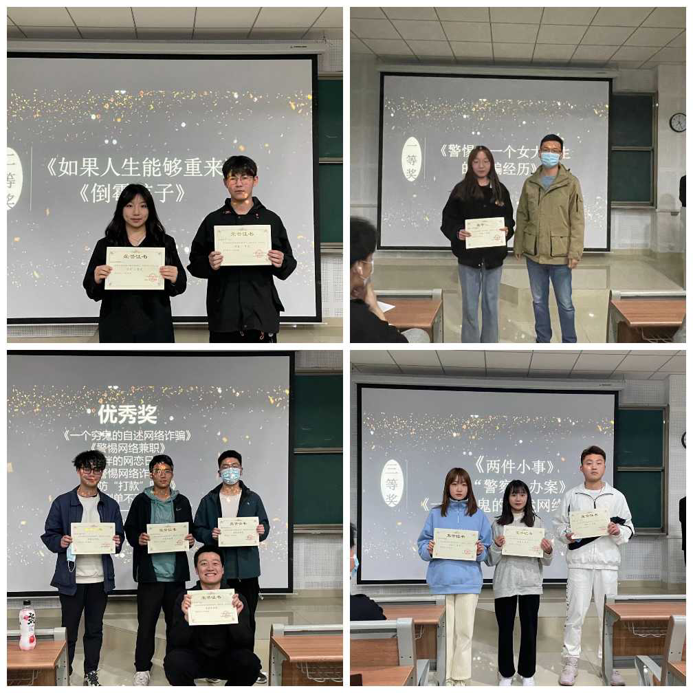 本次比赛中,作品《警惕!一个女大学生的被骗经历》荣获一等奖,作品《如果人生能够重来》、《倒霉孩子》获得二等奖,作品《两件小事》、《“警察”办案》、《一个穷鬼的自述网络诈骗》获得三等奖,还有《警惕网络兼职》、《小胖的网恋日记》、《警惕网络诈骗》等作品获得优秀奖。