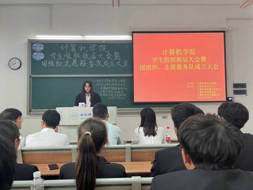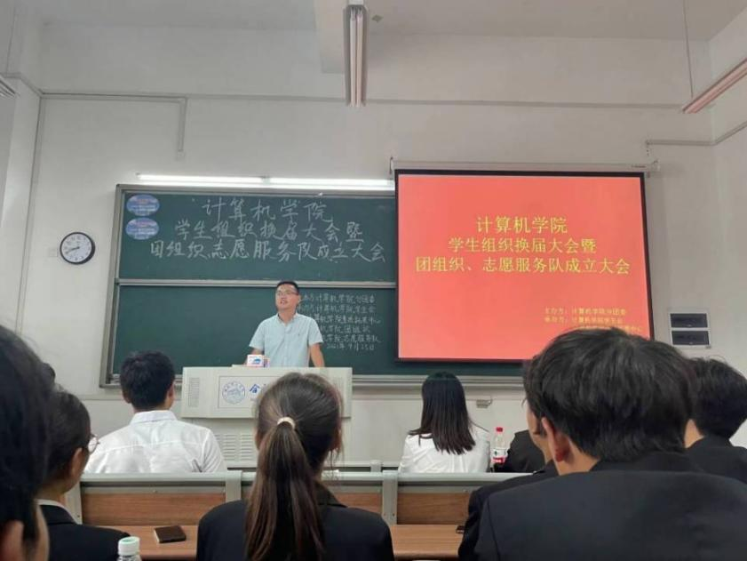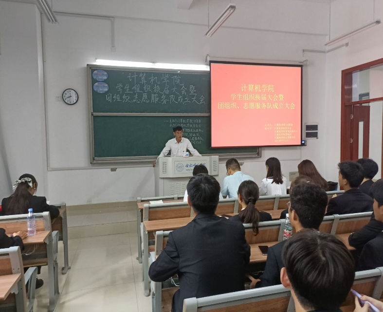 9月25日下午三点,计算机学院学生组织换届大会暨团组织、志愿服务队成立大会在我校滨湖校区博学楼A104教室举行。计算机学院分团委书记陈阳老师、主席团以及学生会全体工作人员参加此次会议。