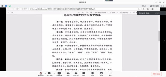 11月22日,计算机学院学生会召开关于高校学生组织作风建设警示教育线上会议,会议由计算机学院执行主席代志成主持,主席团成员及全体学生会工作人员参加本次大会。