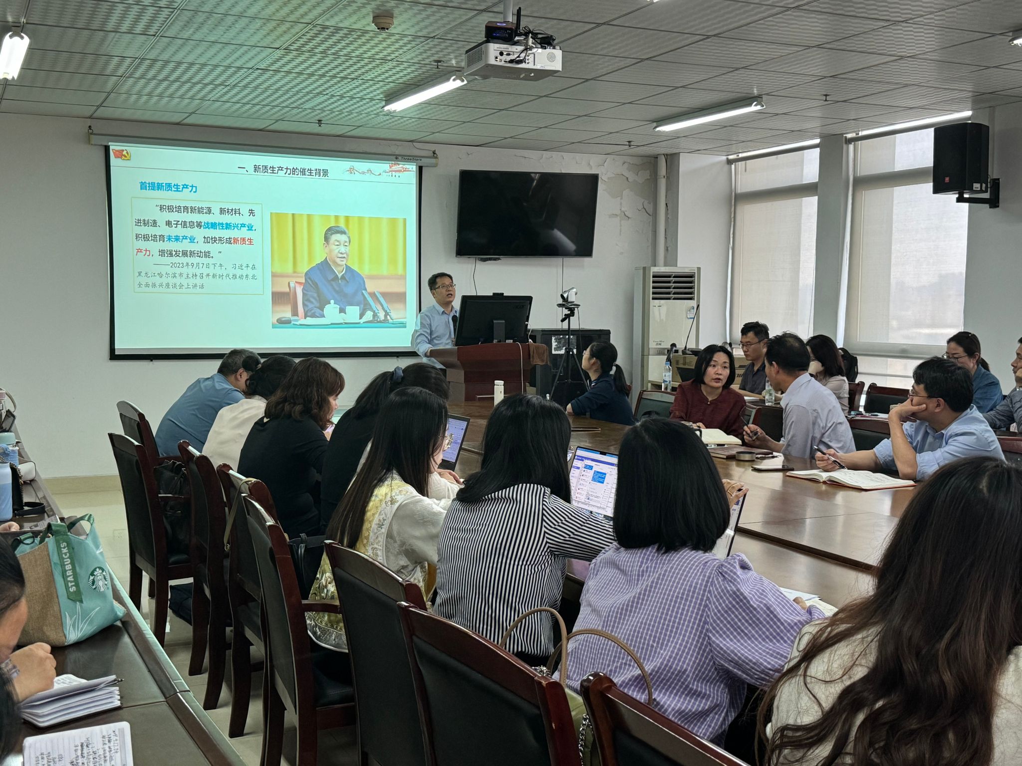 5月9日下午,马克思主义学院朱玉利老师为澳门十大网投平台排行全体教职工开展以“新质生产力”为题的学术讲座,宣讲会由澳门十大网投平台排行党委书记王祥主持。