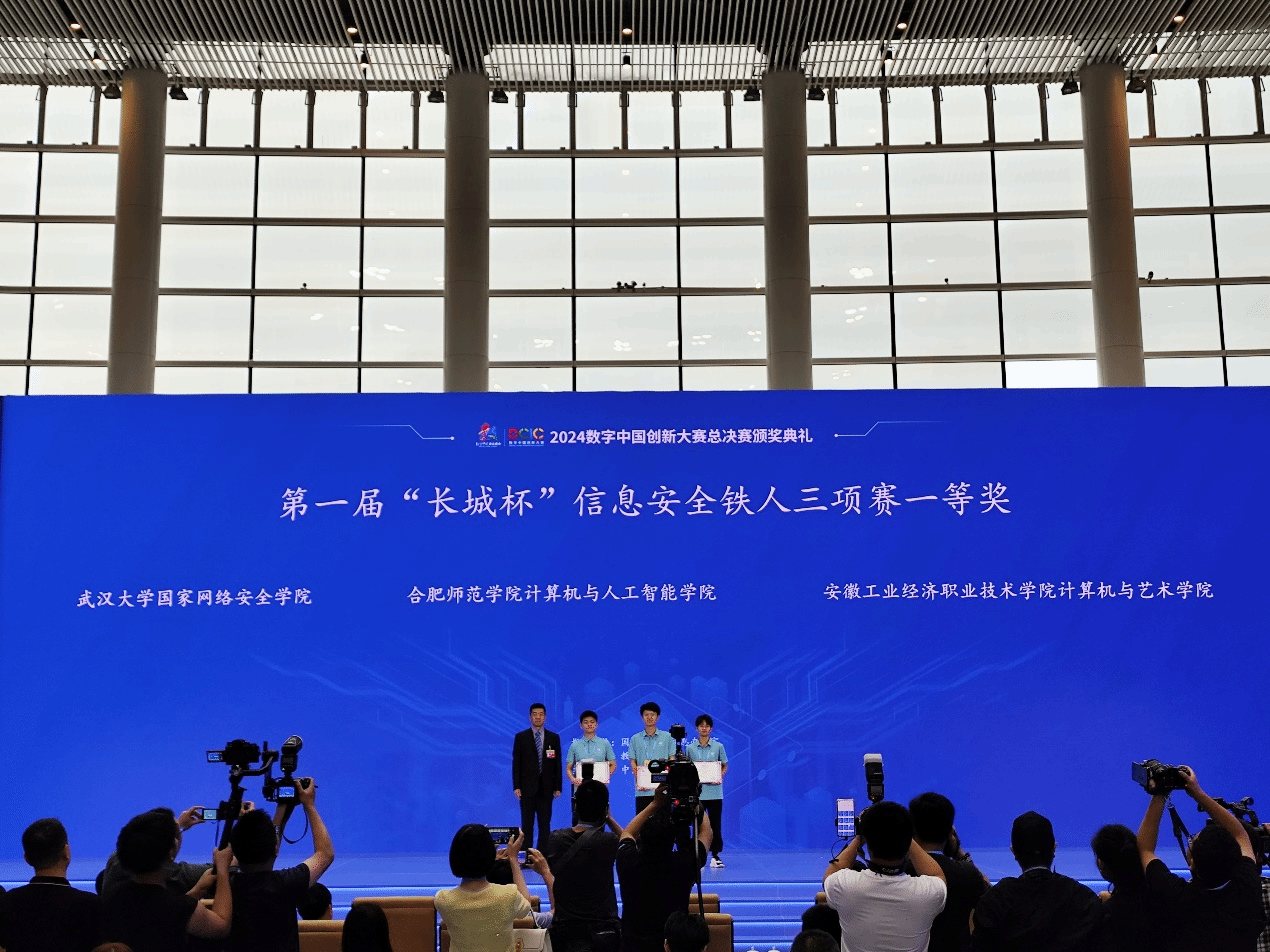 第七届数字中国建设峰会5月24日在福建省福州市开幕,中共中央政治局常委、国务院副总理丁薛祥出席开幕式并发表主旨讲话。作为数字中国建设峰会的重要赛事,第一届“长城杯”信息安全铁人三项赛决赛得到国家数据局、福州市委、市政府的大力支持,在峰会期间成功举办。本次大赛以“网络智能防御,开启数字安全新时代”为主题,旨在打造高校网络安全权威赛事,聚焦培养卓越网络安全专业人才,促进网络安全产业持续发展。大赛展现了一场智力与技术的巅峰对决,来自86所高校400余名师生会师决赛。合肥师范学院澳门十大网投平台排行代表队经过初赛和半决赛的层层筛选,参加了本次总决赛。