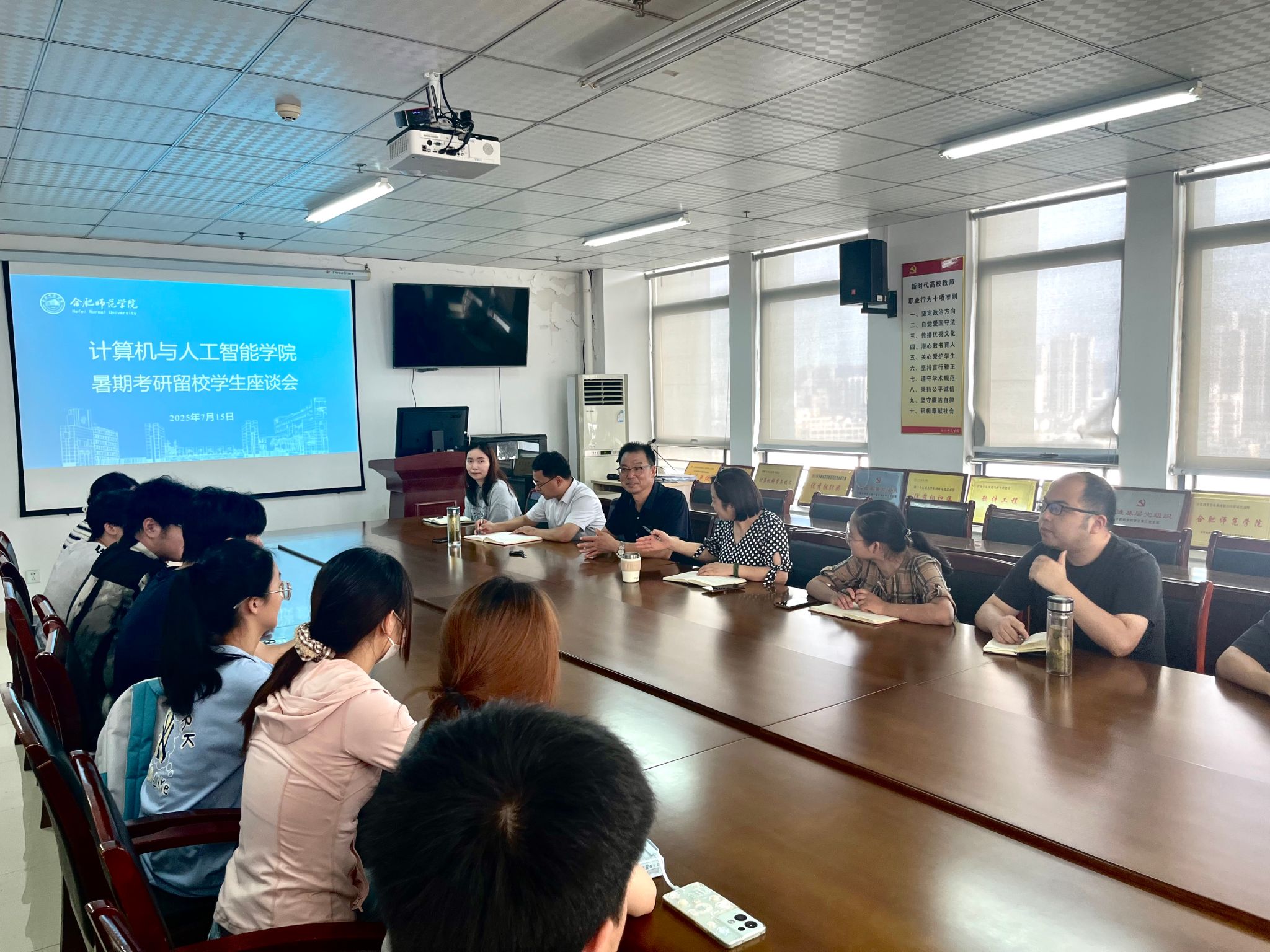 针对学生代表提出的诉求与困惑,学院领导和老师逐一耐心回应。谢飞针对学生考研经验交流、复习规划进度、院校选择等进行详细解答,并鼓励同学们珍惜暑期备考黄金期,保持积极心态,合理规划复习进度,学院将全力做好服务保障工作,与同学们并肩作战,助力大家实现考研梦想。杨萍和刘路路对学生在学习和生活中遇到的问题进行了针对性回应和细致解答,强调留校学生要提高安全防范意识,切实保护好自身安全。陈黎伟老师和毕业班辅导员也分别做了考研经验交流分享。考研既是一场考验知识储备的持久战,更是一场磨炼心智的心理战。鼓励同学们要坚定考研信念,充分利用暑期这段备考“黄金期”实现突破提升。
