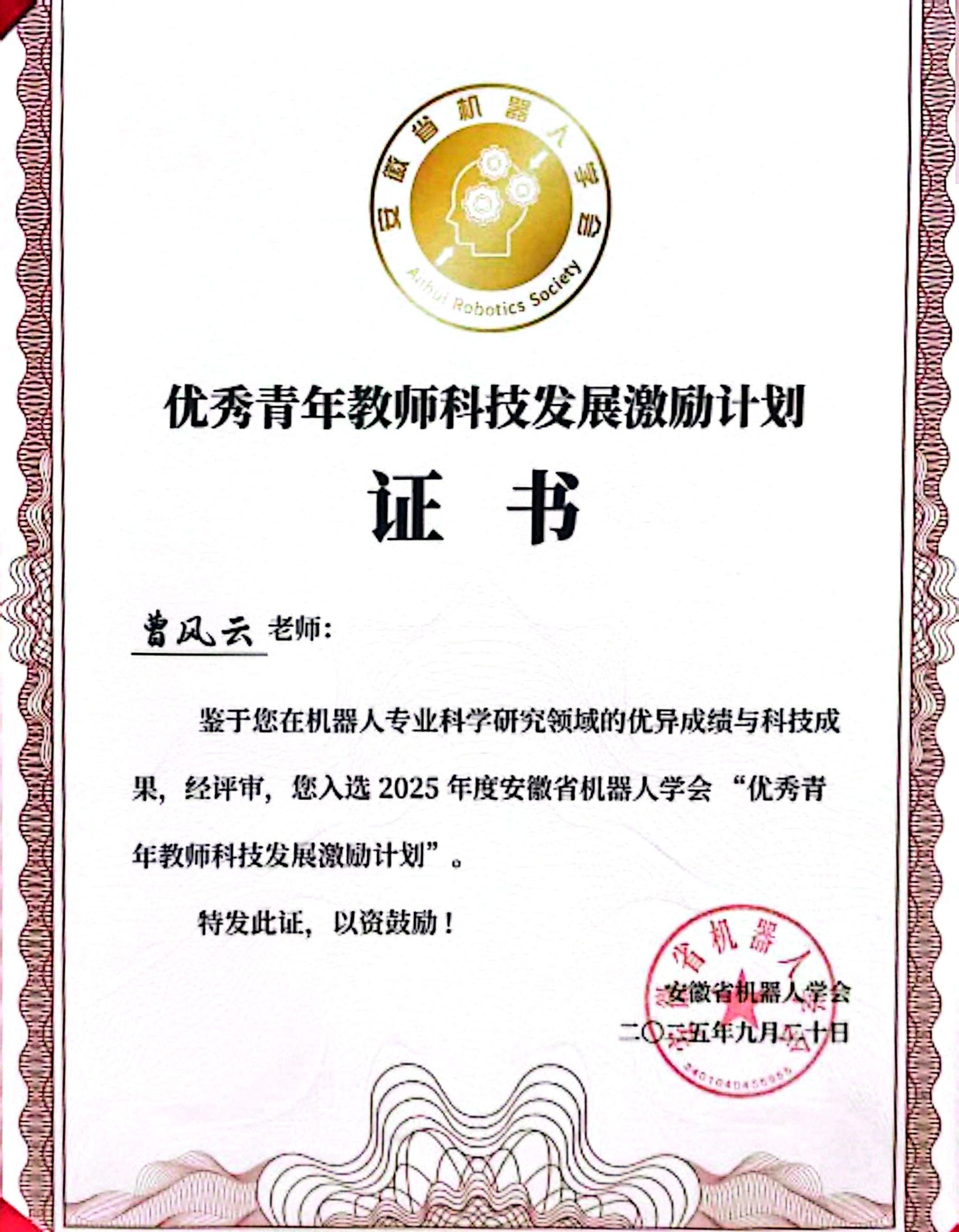 近日,第三届安徽省机器人大会暨智能机器人产业生态发展论坛在安徽工程大学召开,会上颁发了安徽省机器人学会2025年度奖励。澳门十大网投平台排行曹风云老师荣获优秀青年教师发展激励计划奖励。